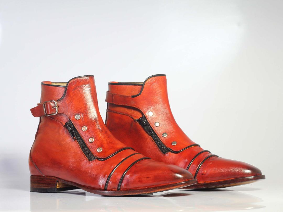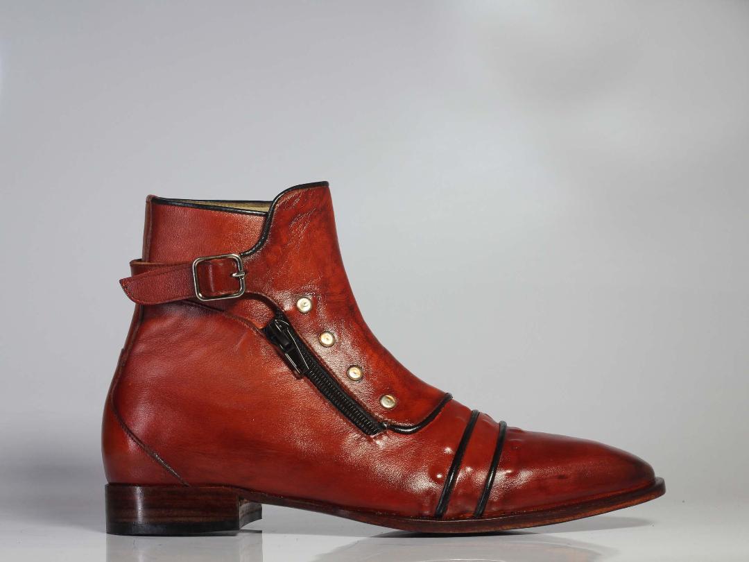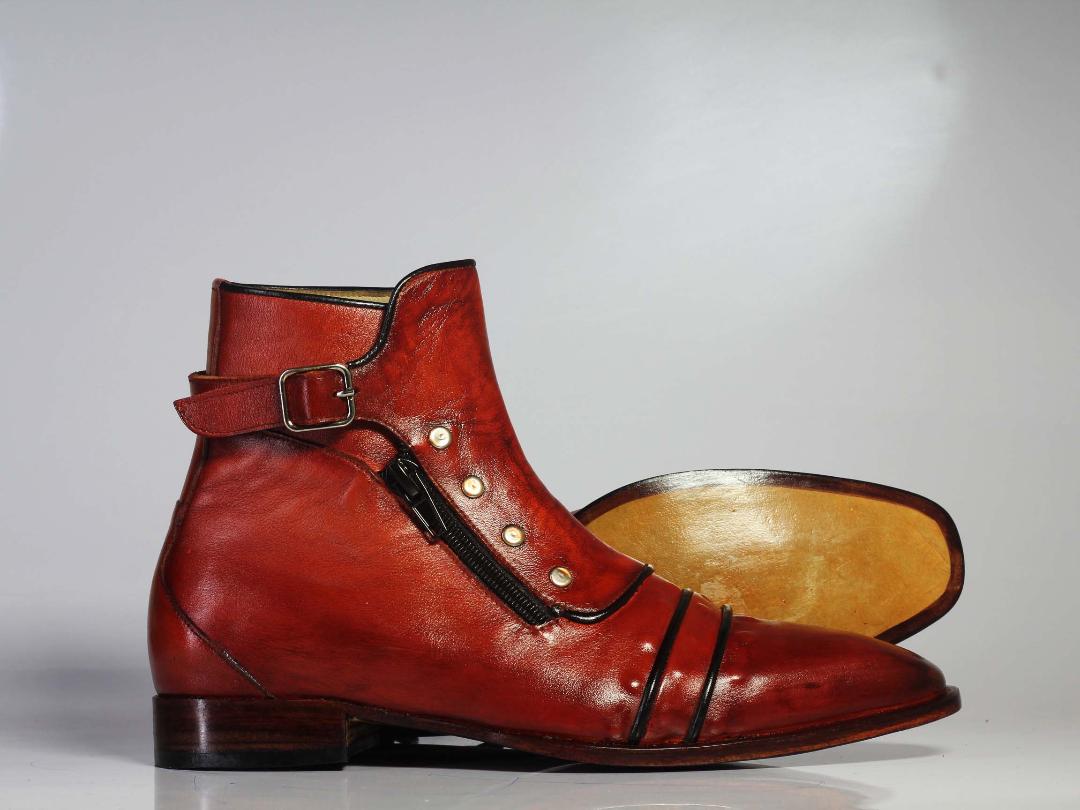 Handmade Men's Ankle High Burgundy Cap Toe Buckle With Zip Style Leather Boots