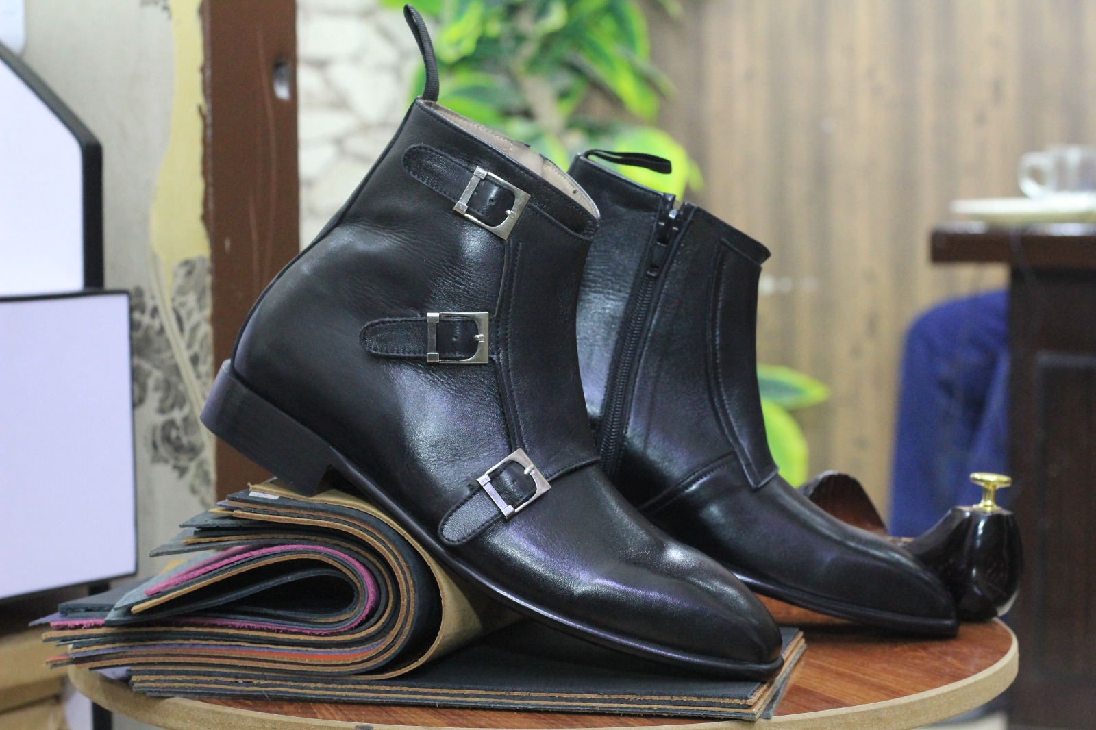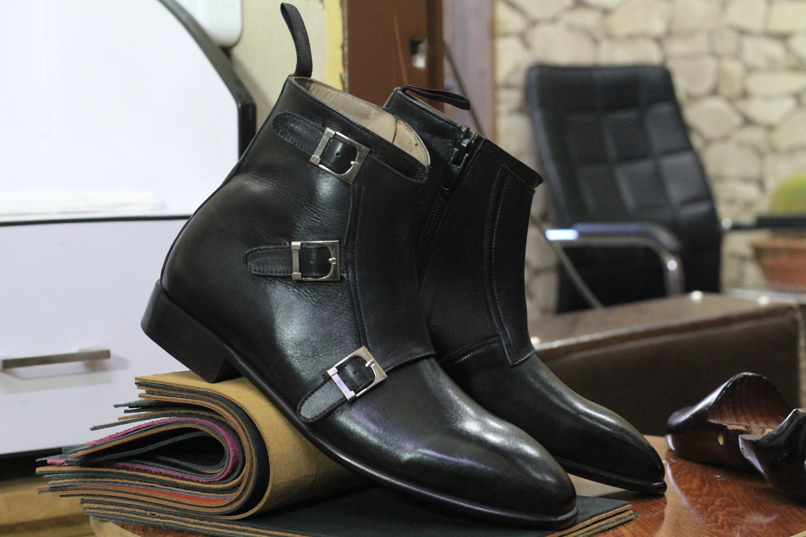 Ankle High Triple Buckle Style New Fashion Side Zipper Men's Black Color Hand Stitched Leather Boots