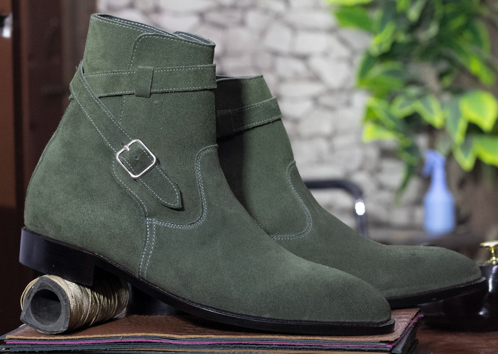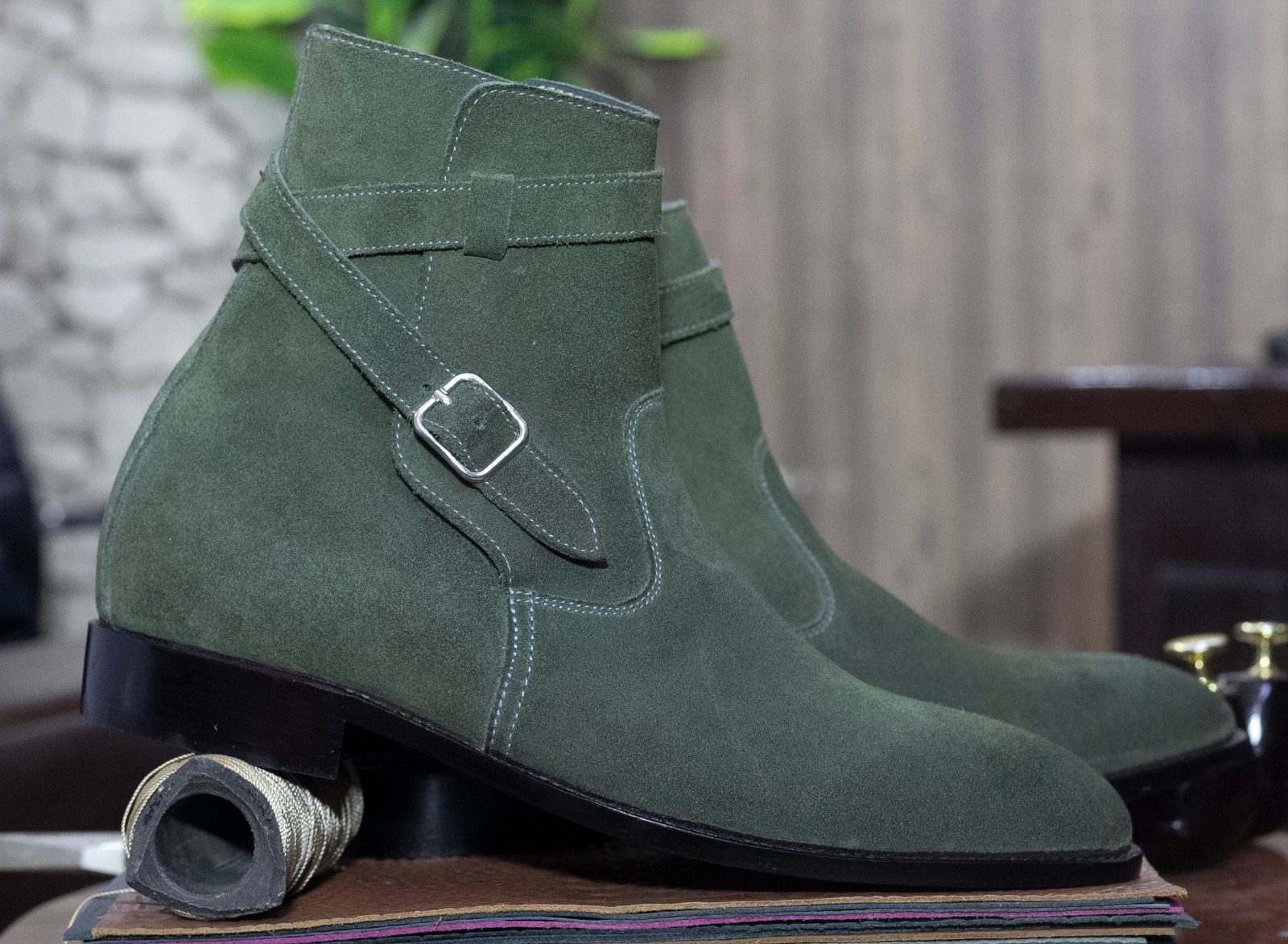 Men's Jodhpur Style Green Color Suede Ankle High Luxury Boots