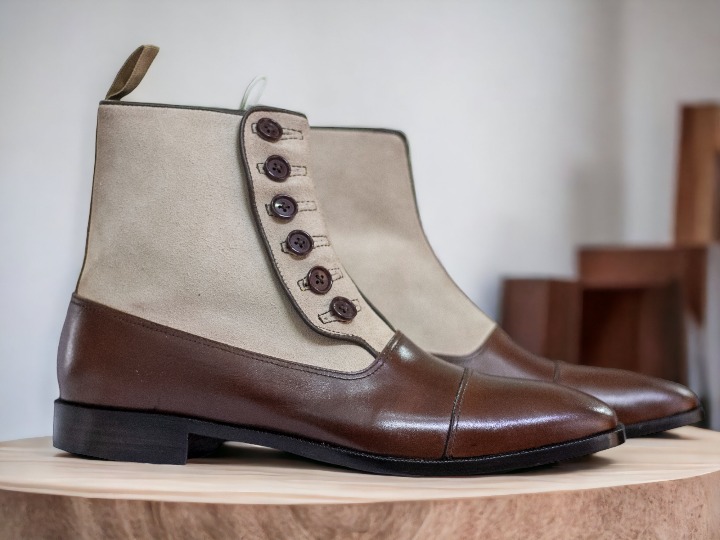 Two tone Color Handmade Leather Suede Button Top and Cap Toe Style Ankle Boots for Men's