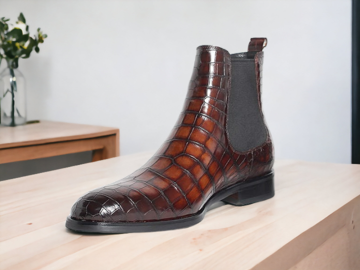 Two Shaded Color New Chelsea Style Alligator Texture Pure Handmade Leather Ankle Men's Boots