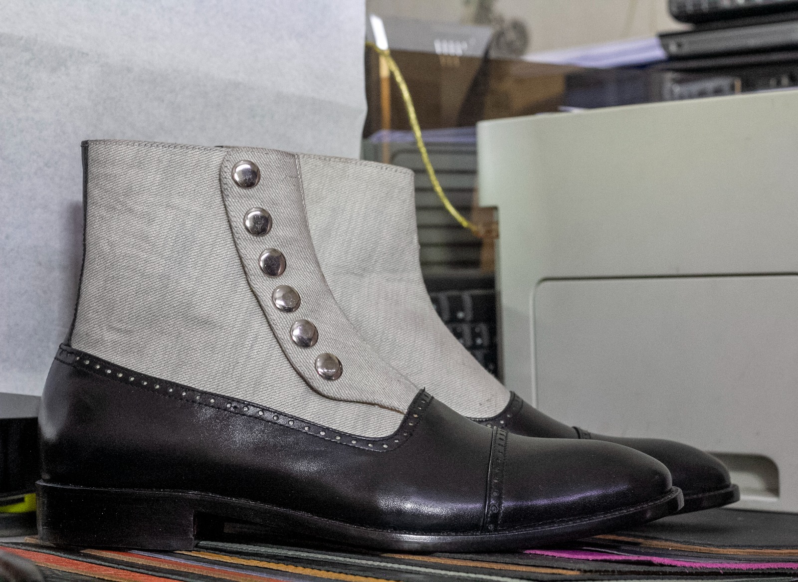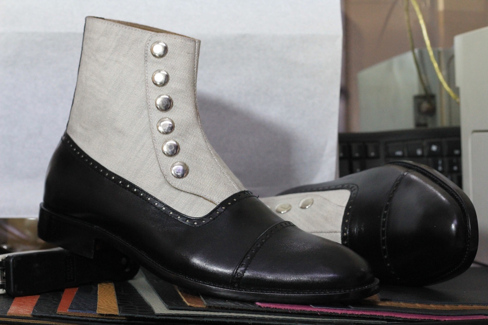 Handmade Men's Two tone Leather & Cotton Button Boot