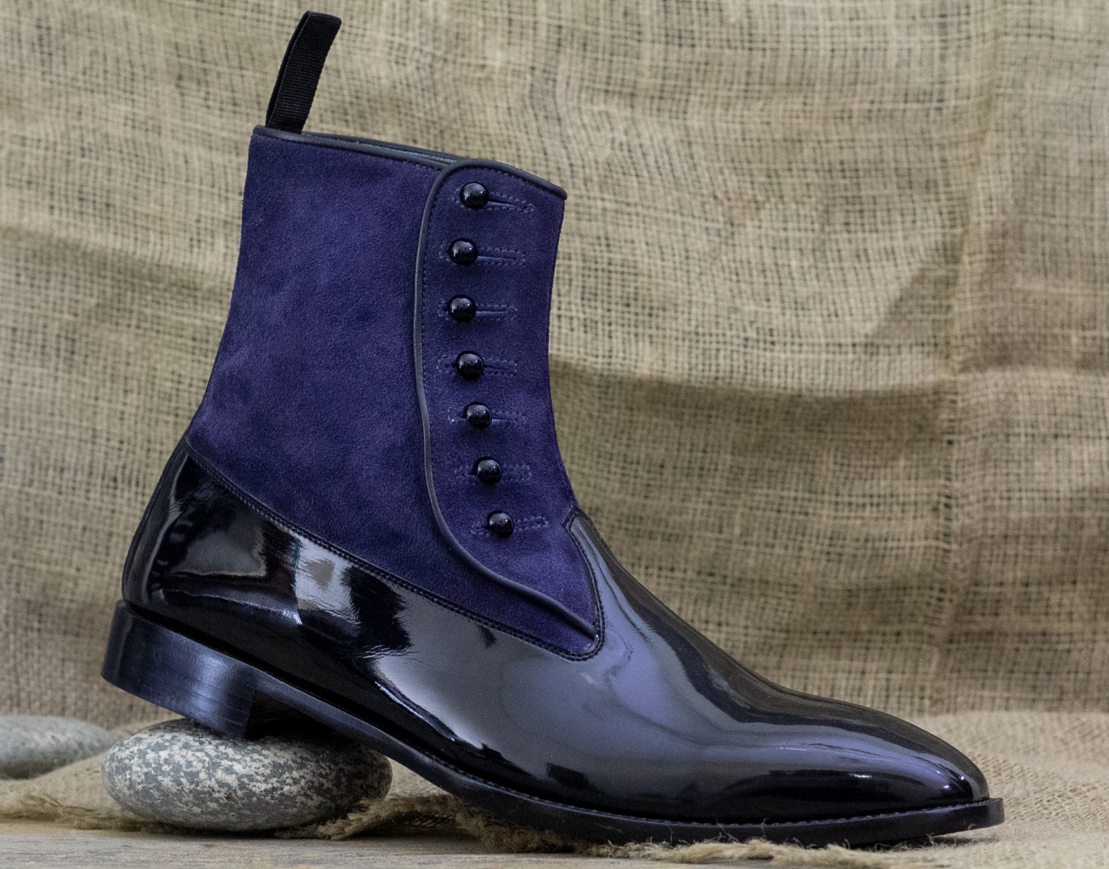Handpainted Men's Black Leather & Blue Suede Button Boot