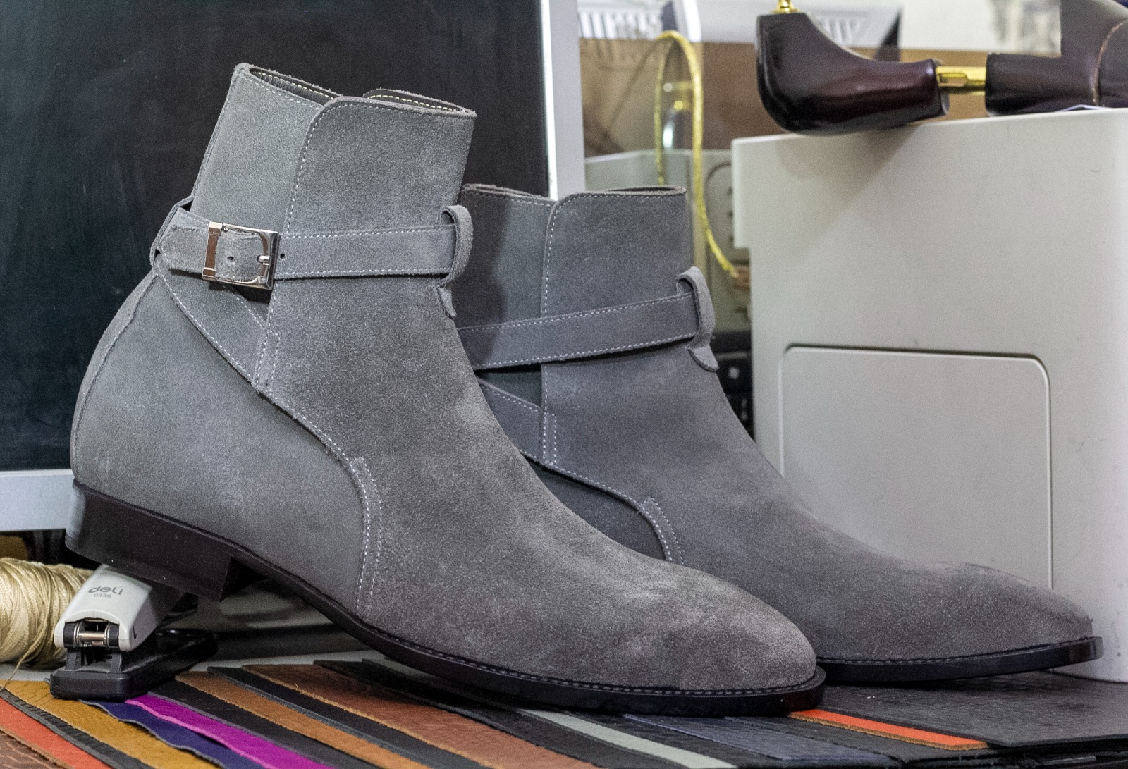Handmade Men's Gray Suede Singal Monk Buckle Ankle Boots