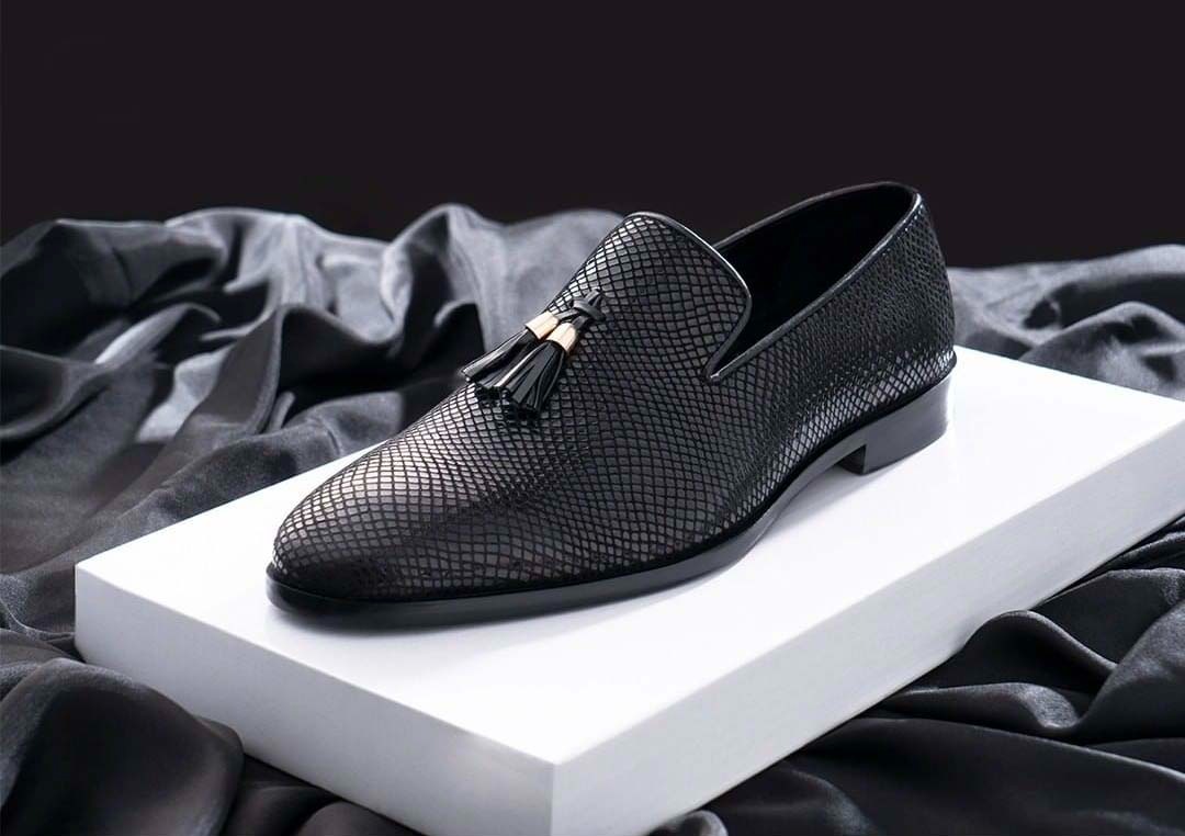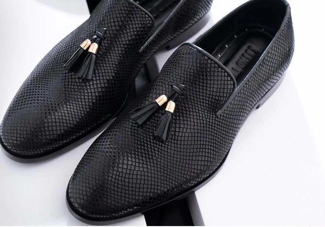 Men's Black Python Leather Handmade Tassel Slip On Loafer Shoes