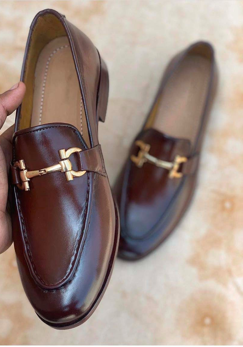 Brown Fashion Handmade Men's Leather Horse Bit Slip On Loafer Shoes