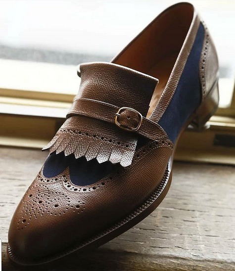 Handmade Men's Leather & Suede Wing Tip Brogue Toe Two Tone Fringe Buckle Loafer Shoes