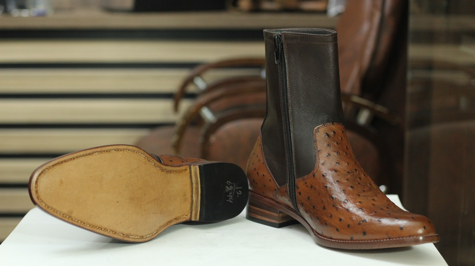 Handmade Men's Two Tone Ostrich Leather Zipper Ankle High Boots