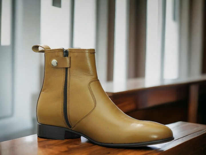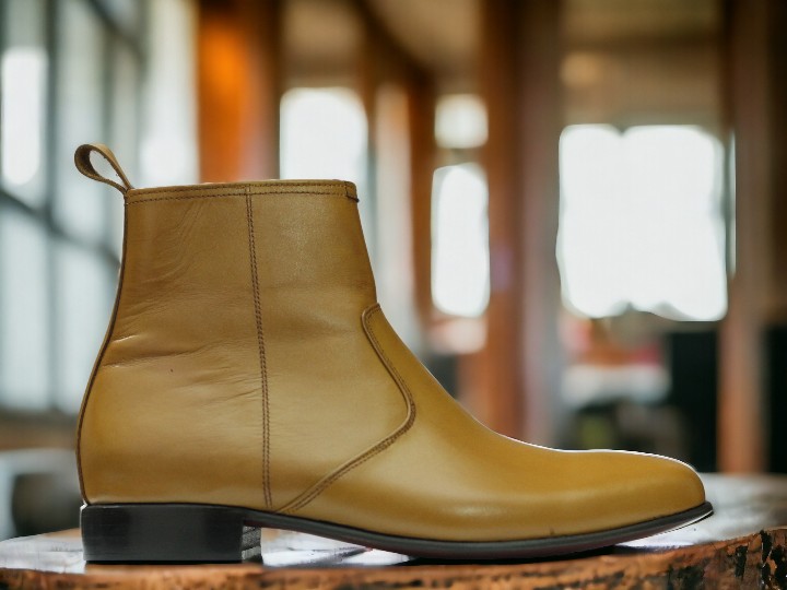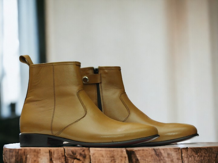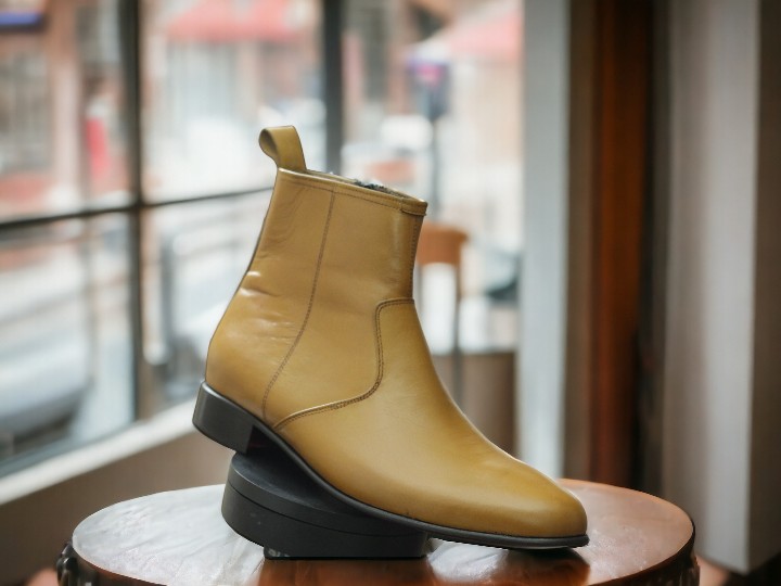Handmade Men's Mustard Leather Boot Ankle High ,Zipper Boot