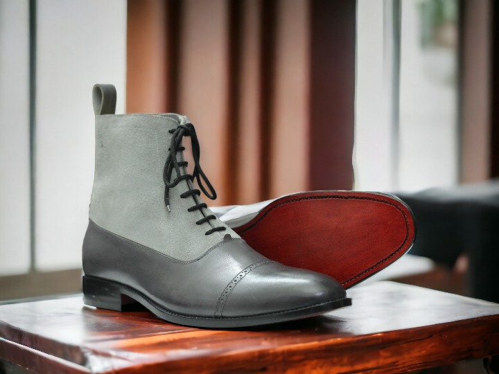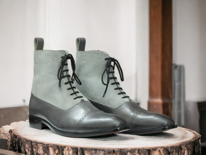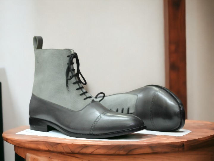 Handmade Men's Gray Leather and Suede Boot ,Lace Up Ankle High Boot