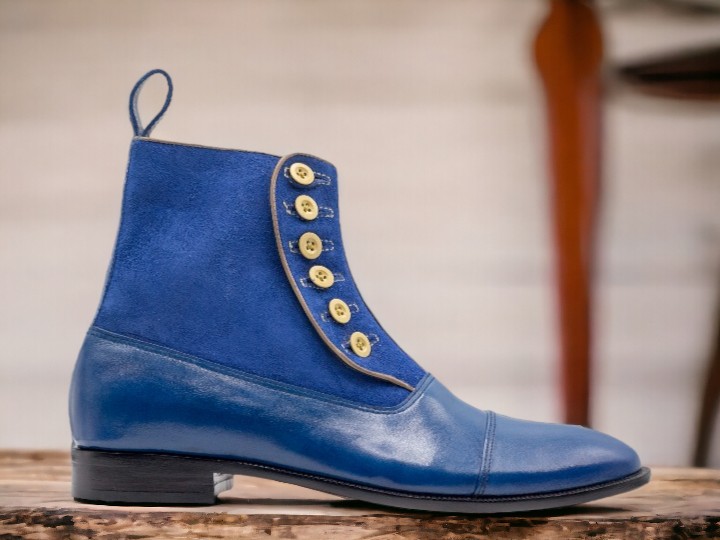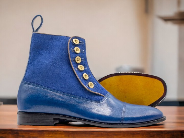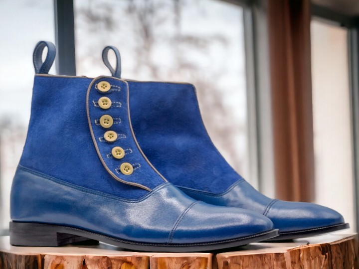 Handmade Men's Blue Boot ,Ankle High Button Top Cap Toe Leather Suede Boot
