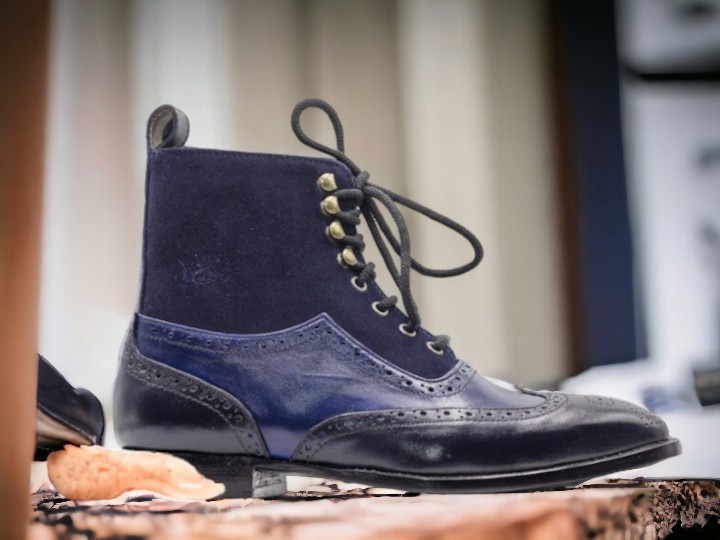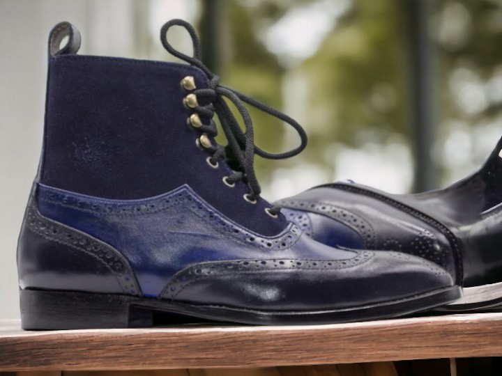 Handmade Men's Blue three tone Suede and Leather Boot ,Wing Tip Brogue Toe Lace Up Boot