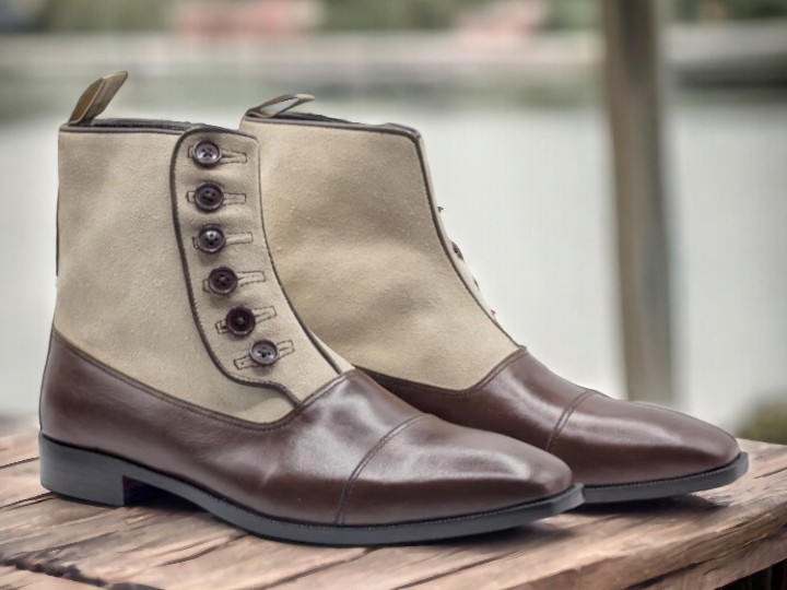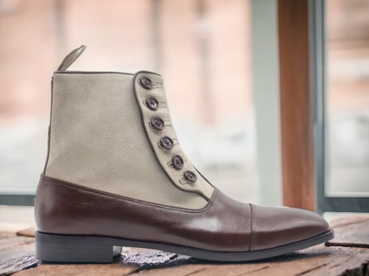 Handmade Men's Two Tone Brown Leather and Suede Boot ,Button Ankle High Boot