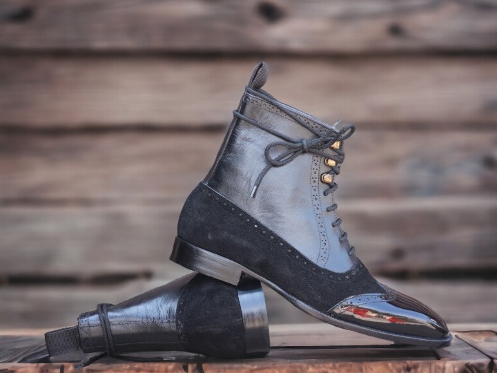 Handmade Men's Black Leather and Suede Boot ,Lace Up Wing Tip Ankle High Boot