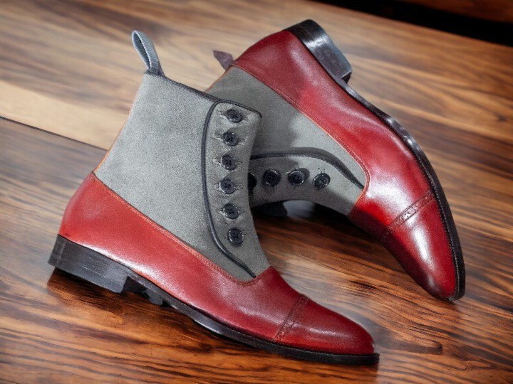Handmade Men's Red and Gray Boot ,Ankle High Button Top Cap Toe Leather Suede Boot