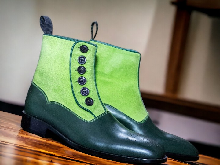 Handmade Men's Two Tone Green Boot ,Ankle High Button Top Brogue Toe Leather Suede Boot