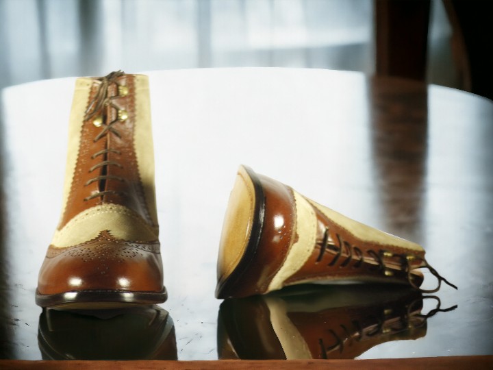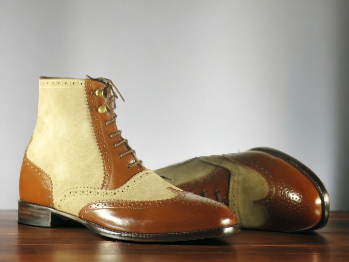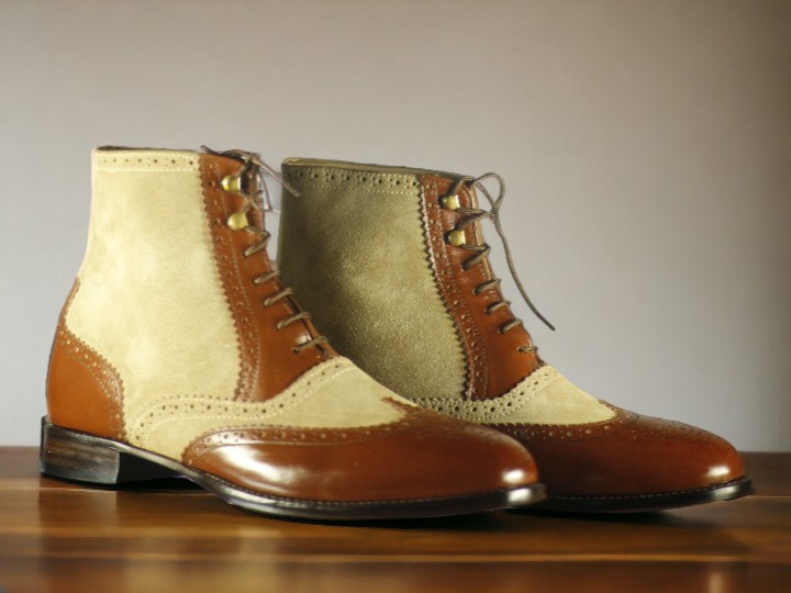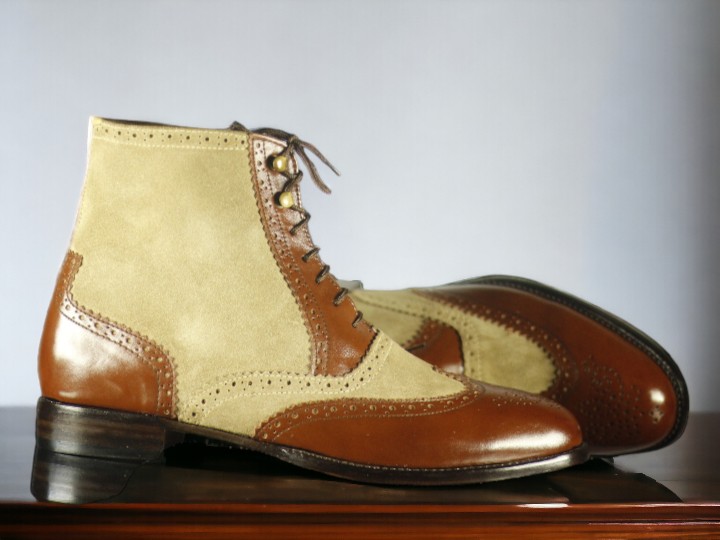 Handmade Men's Brown Beige Leather and suede Boot ,Wing tip Brogue Toe Lace Up Boot