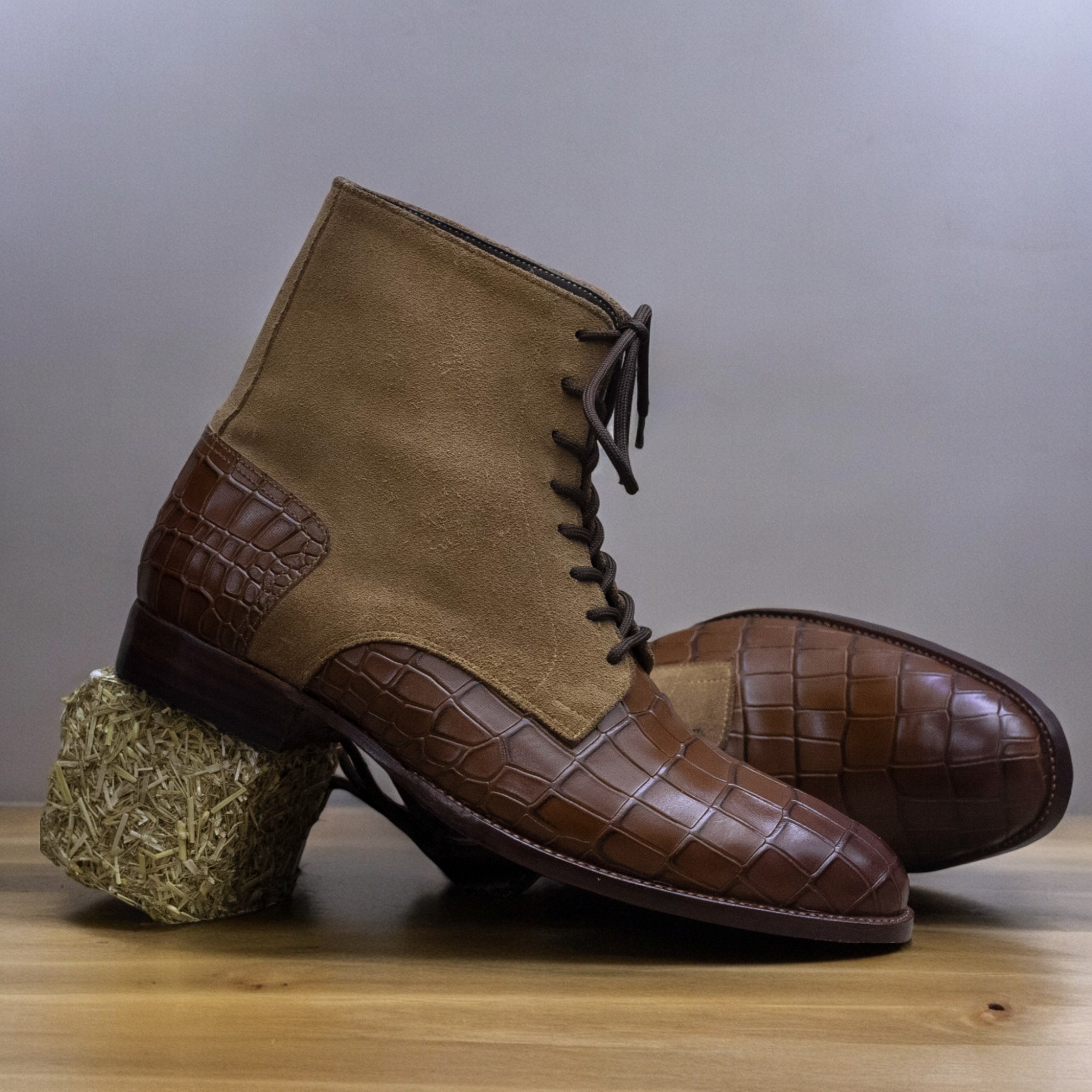 Handmade Men's Brown Two Tone Leather and Suede Boot ,Lace Up Ankle High Boot