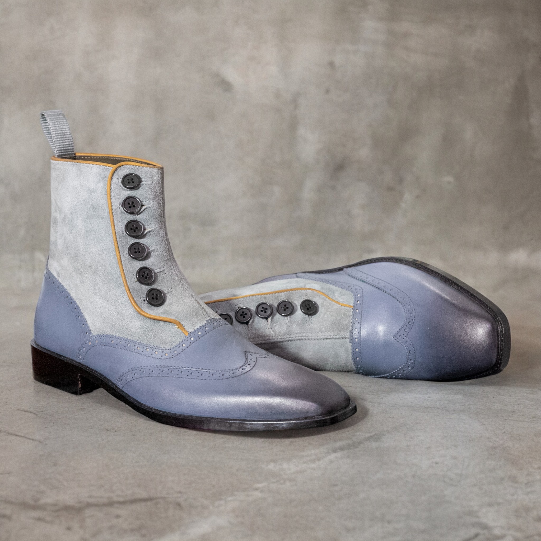 Handmade Men's Gray Two Tone Leather and Suede Boot ,Ankle High Button Wing Tip Boot