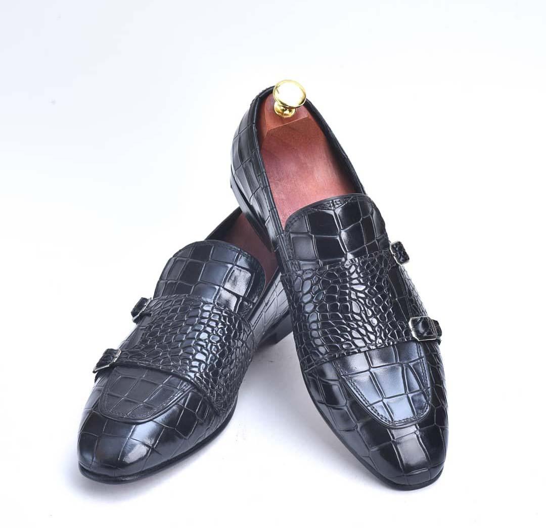 Black Alligator Texture Double Monk Loafer Slip On Shoes For Men's