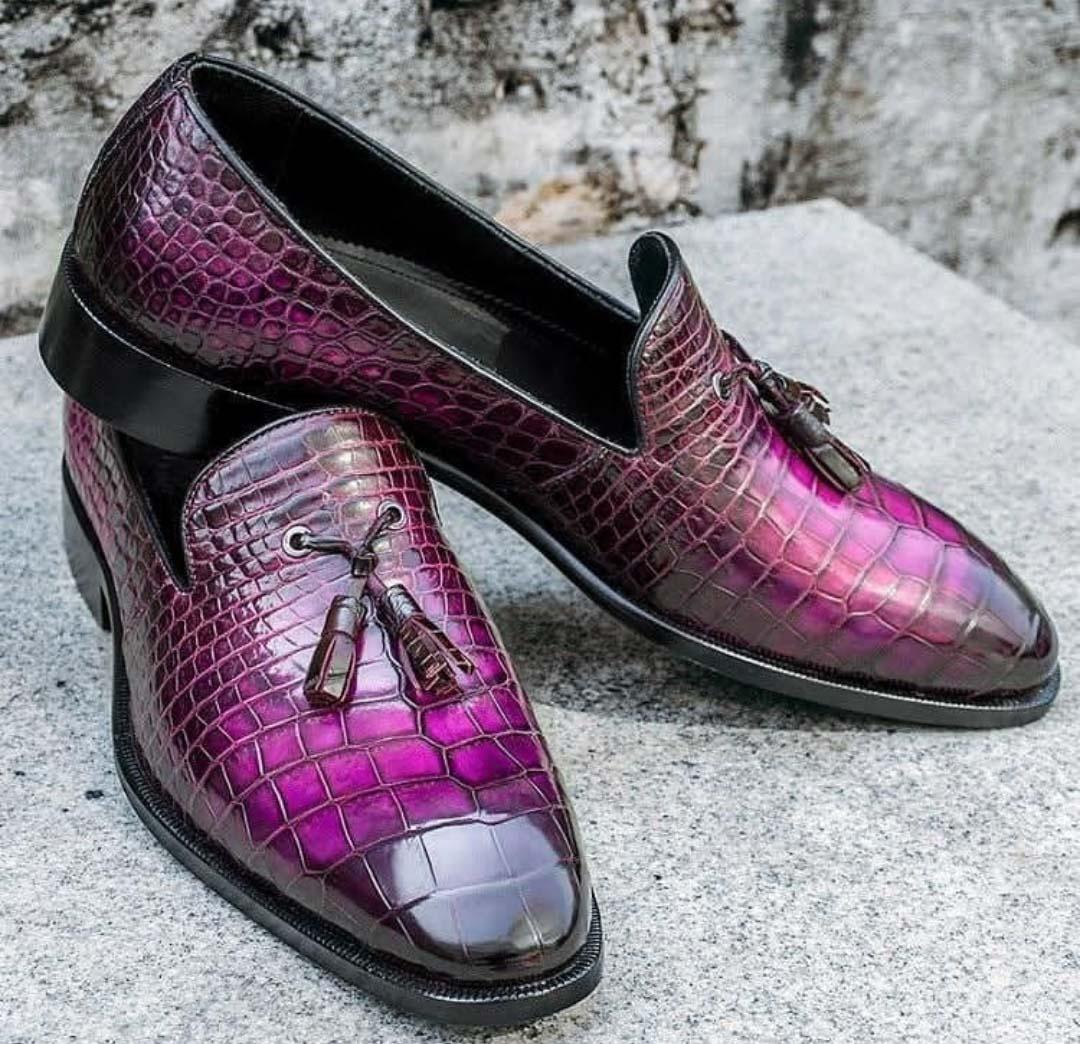 Men's Handmade Two Tone Purple Alligator Texture Loafer Tasseled Stylish Shoes