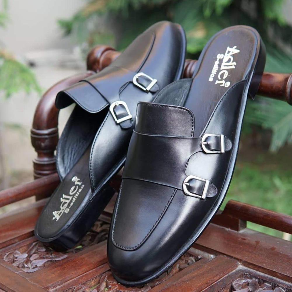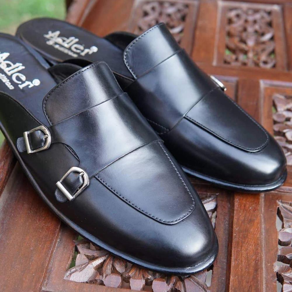 Pure Black Handmade Alligator Texture Double Monk Men's Shoes