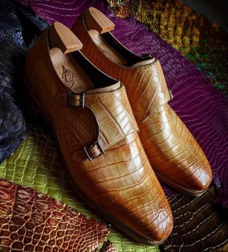 New Pure Handmade Tan Crocodile Leather Monk Strap Stylish Shoes For Men's