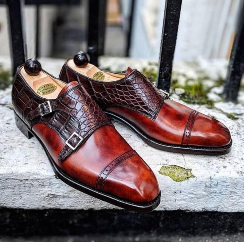 New Pure Handmade Brown Plain & Crocodile Leather Stylish Monk Strap Shoes For Men's