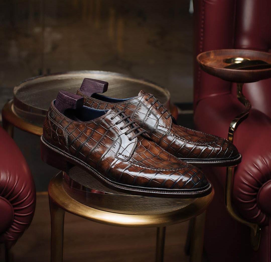 Handmade Round Toe Lace UP Alligator Skin Texture Leather Derby Shoes