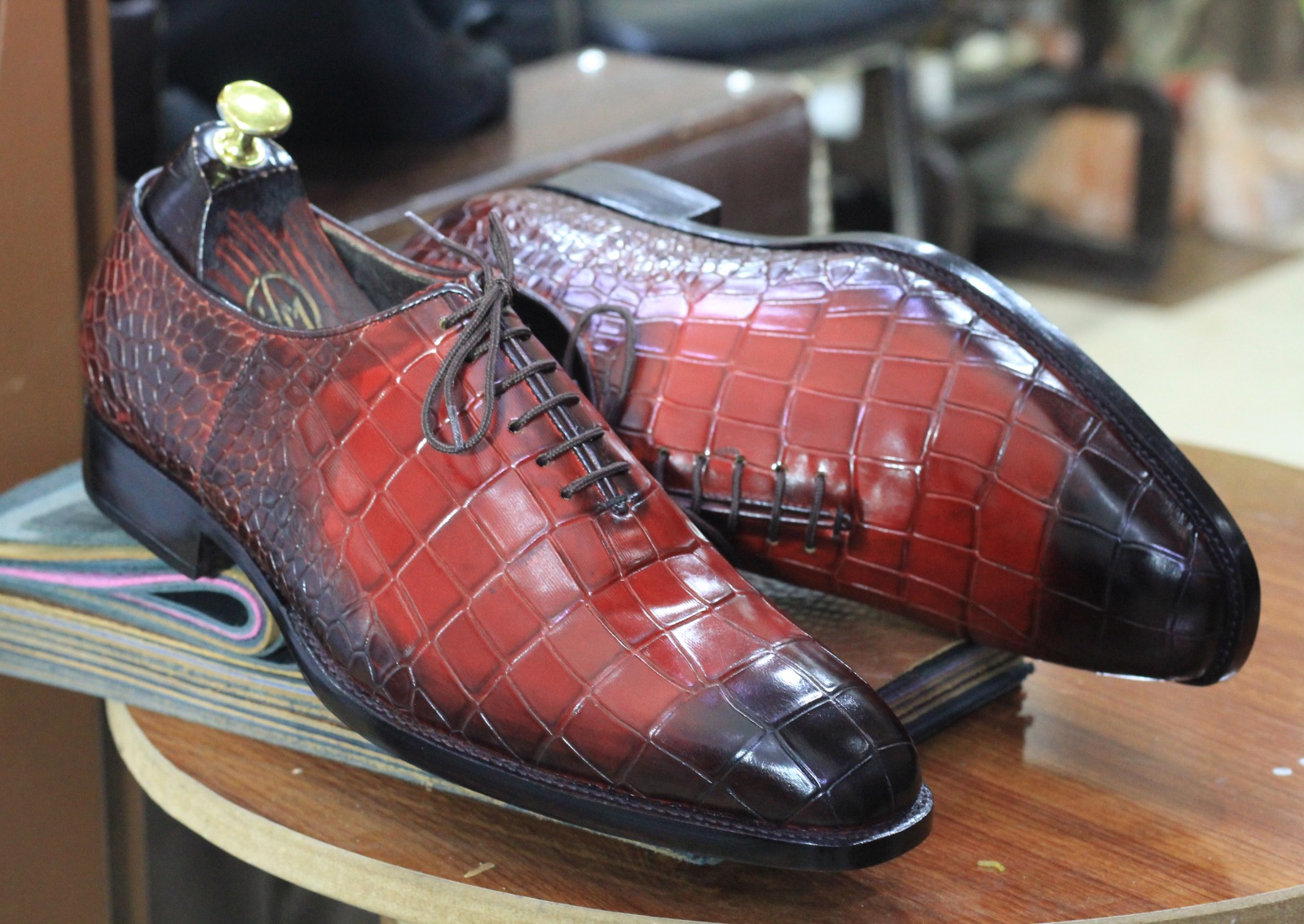 New Fashion Style Alligator Texture Genuine Handmade Leather Lace Up Men's Two Tone Colour Hand Painted Dress Shoes