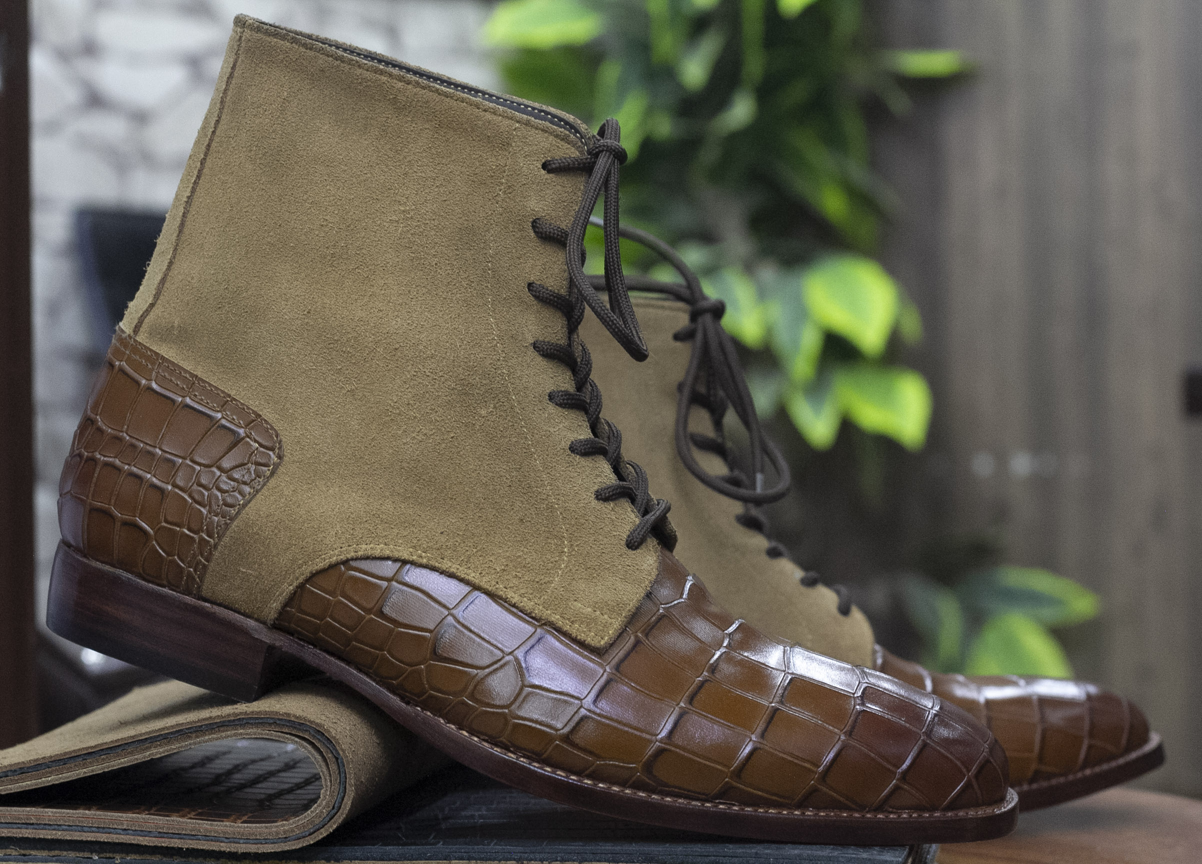 Men's Brown Beige Alligator Skin Texture & Suede Ankle Lace UP Boot