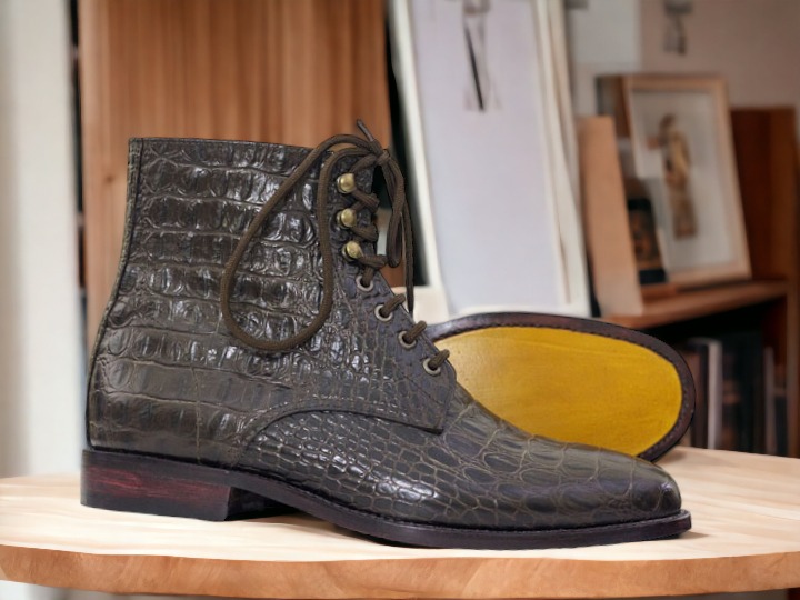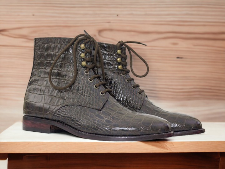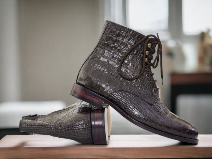 Men's Handmade Pure Crocodile Texture Leather Brown Color Lace Up Style Ankle Boots