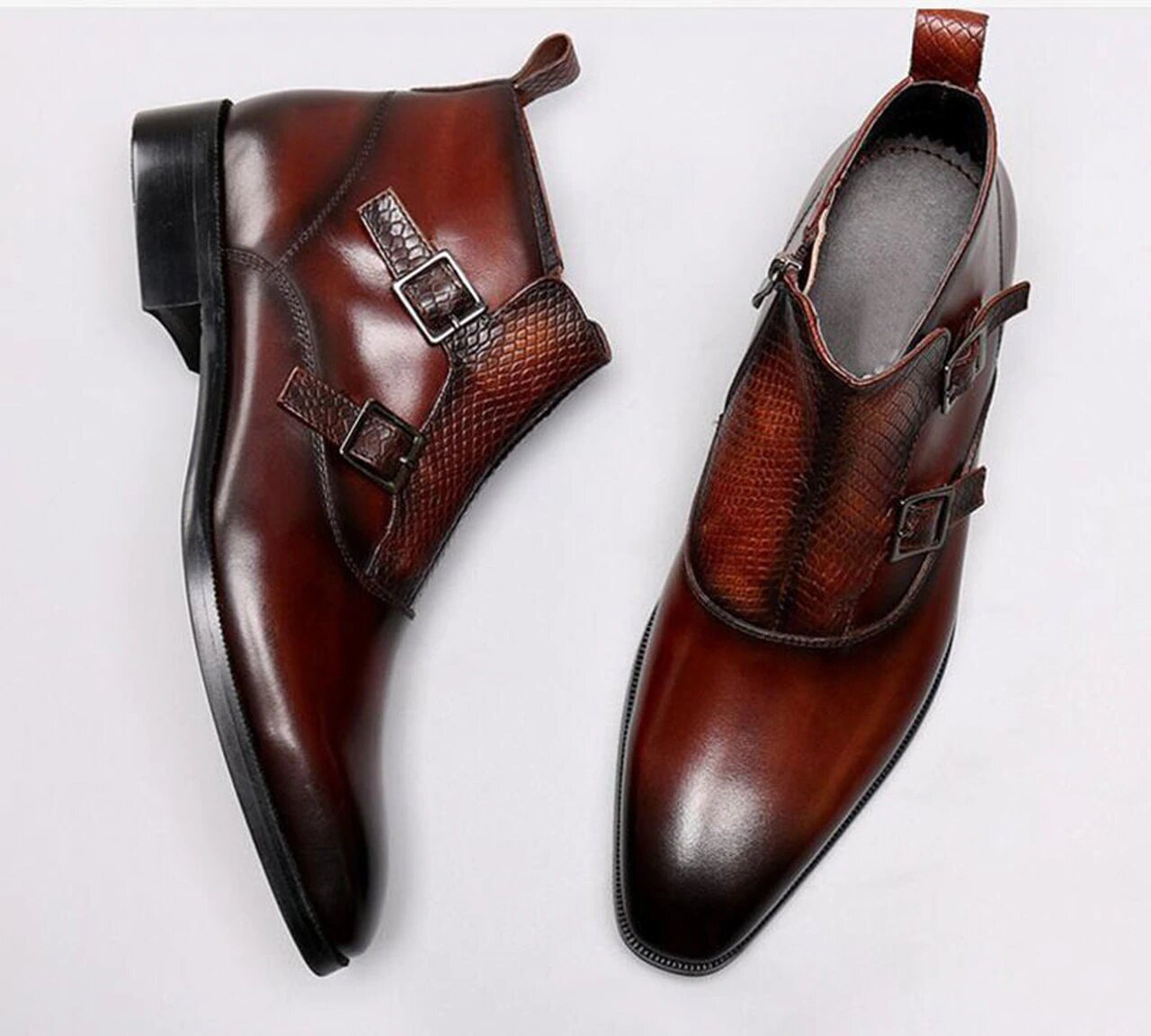 Brown Handmade Men's Leather Double Monk Buckle Ankle Boots