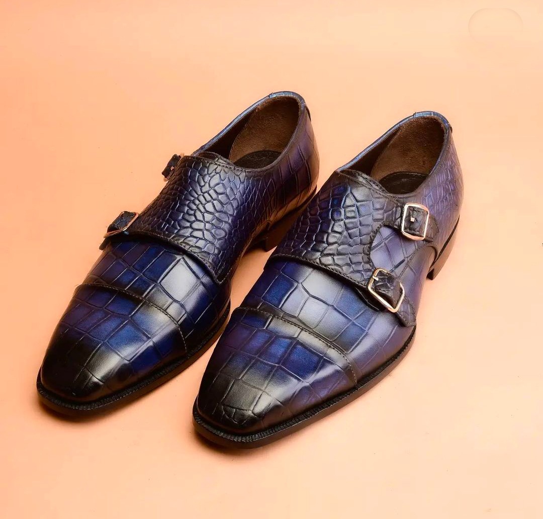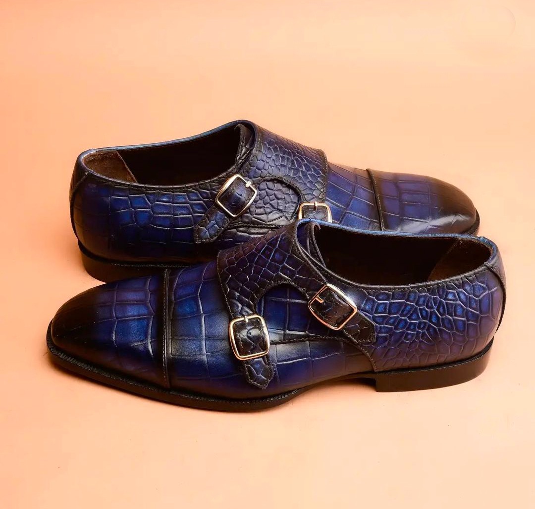 Handmade Blue Alligator Print Leather Double Buckle Cap Toe Men's Dress Shoes