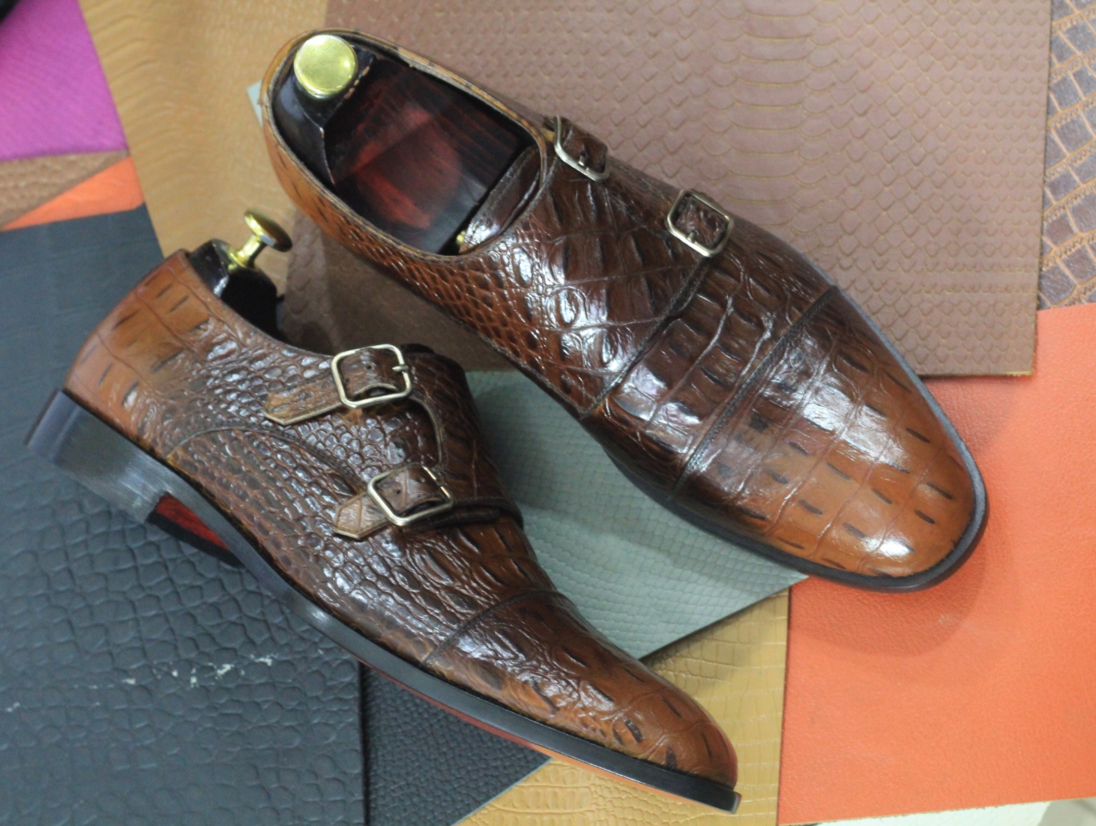Handpainted Men's Brown Cap Toe Double Buckle Alligator Print Fashion Shoes