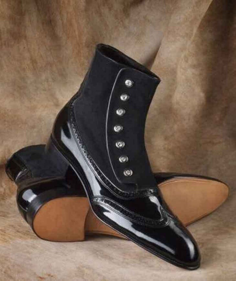 Men's Black Leather & Suede Wing Tip Button Handmade Ankle Boots