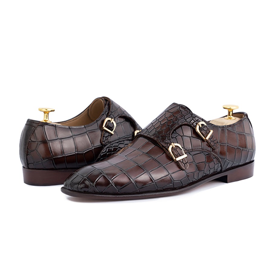 Handmade Men's Brown Alligator Print Leather Double Monk Buckle Office Shoes