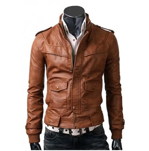 Men Tan Slim Fit Leather Jacket With Flap Pockets