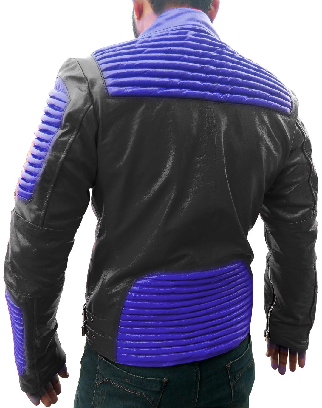 Men Black Biker Speed Ribbed Blue Collar Fashion Leather Jacket Men