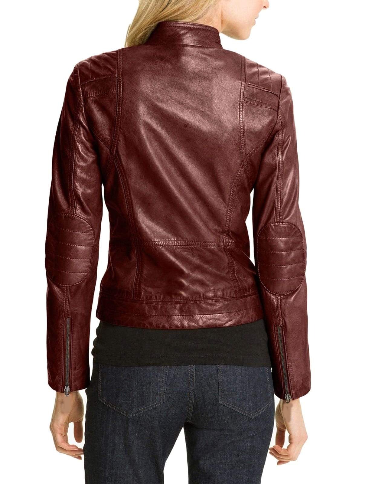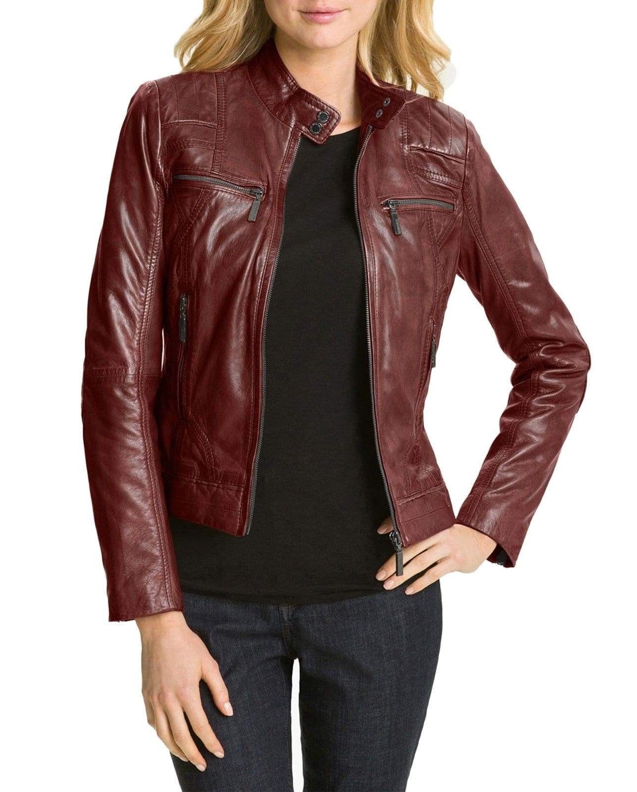Handmade Woman Burgundy Leather Biker Zipper Fashion Jacket