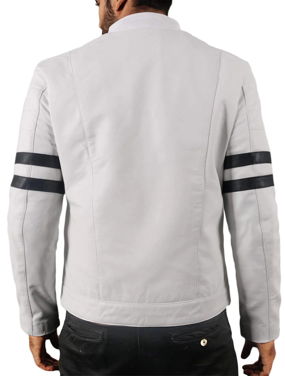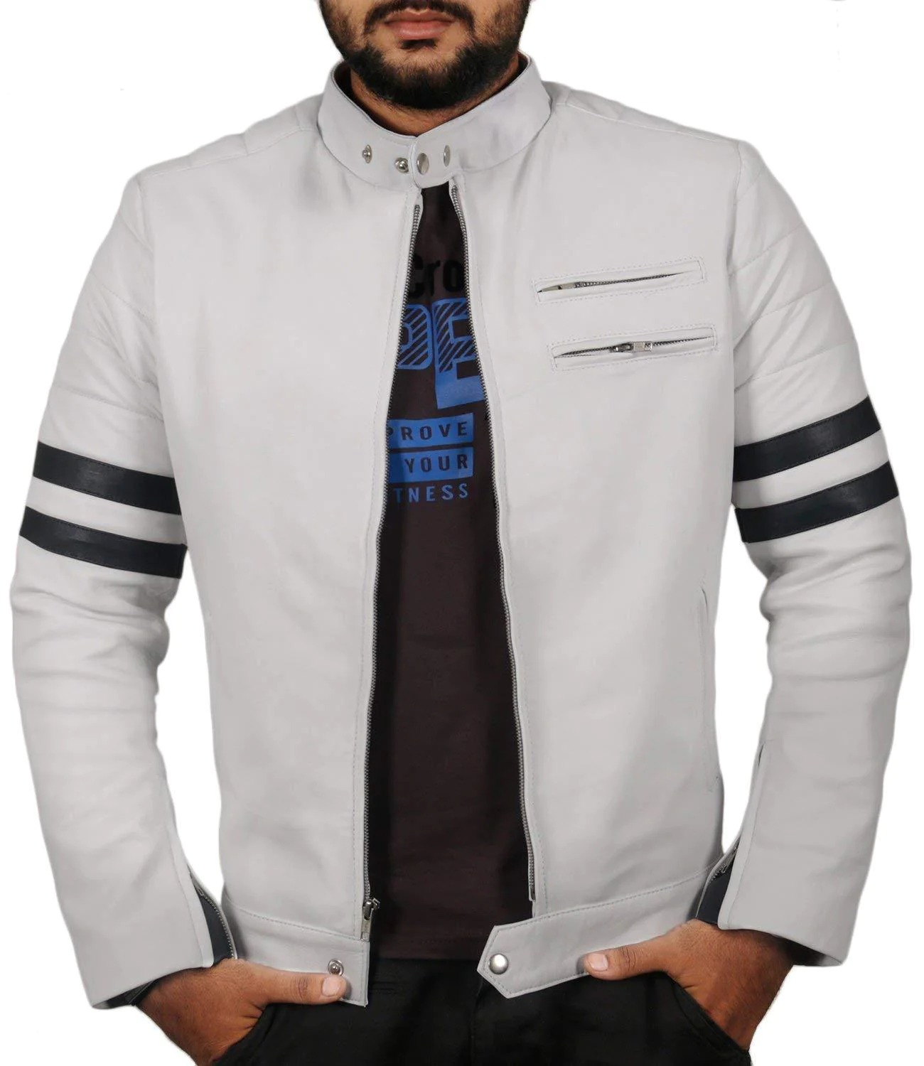 Men's Fashion White Leather Zipper Pocket Black Stripped Biker Handmade Jacket
