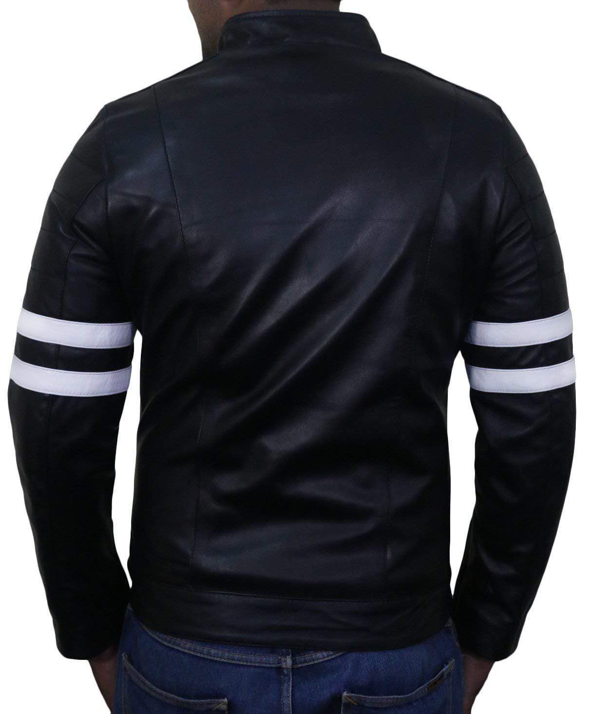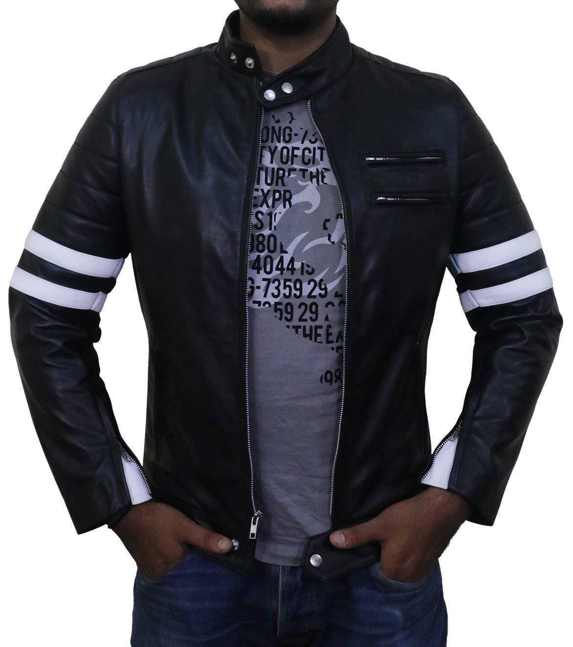 Men's Fashion Black Leather Zipper Pocket White Stripped Biker Handmade Jacket