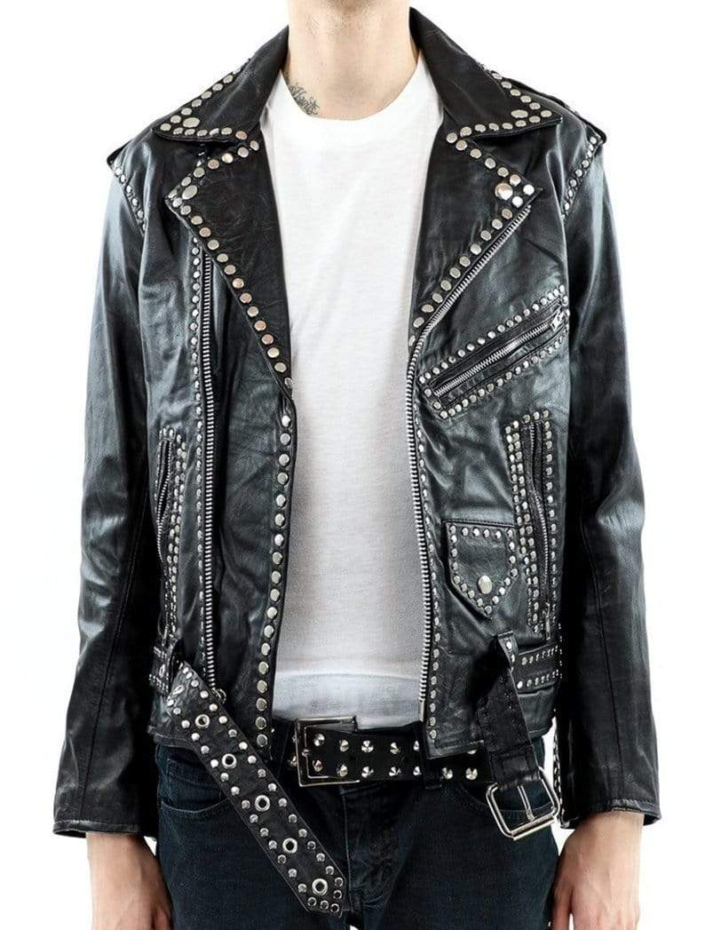 Handmade Men's Black Leather Fashion Silver Studded Belted Jacket