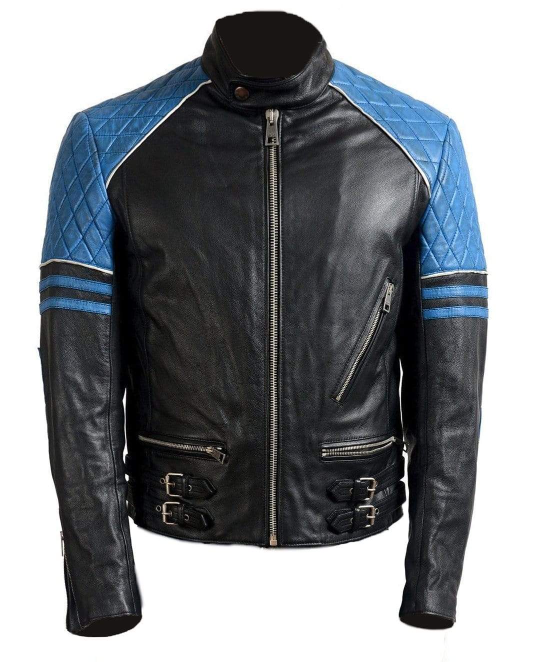 Handmade Men's Blue Black Leather Fashion Double Pocket Zipper Jacket