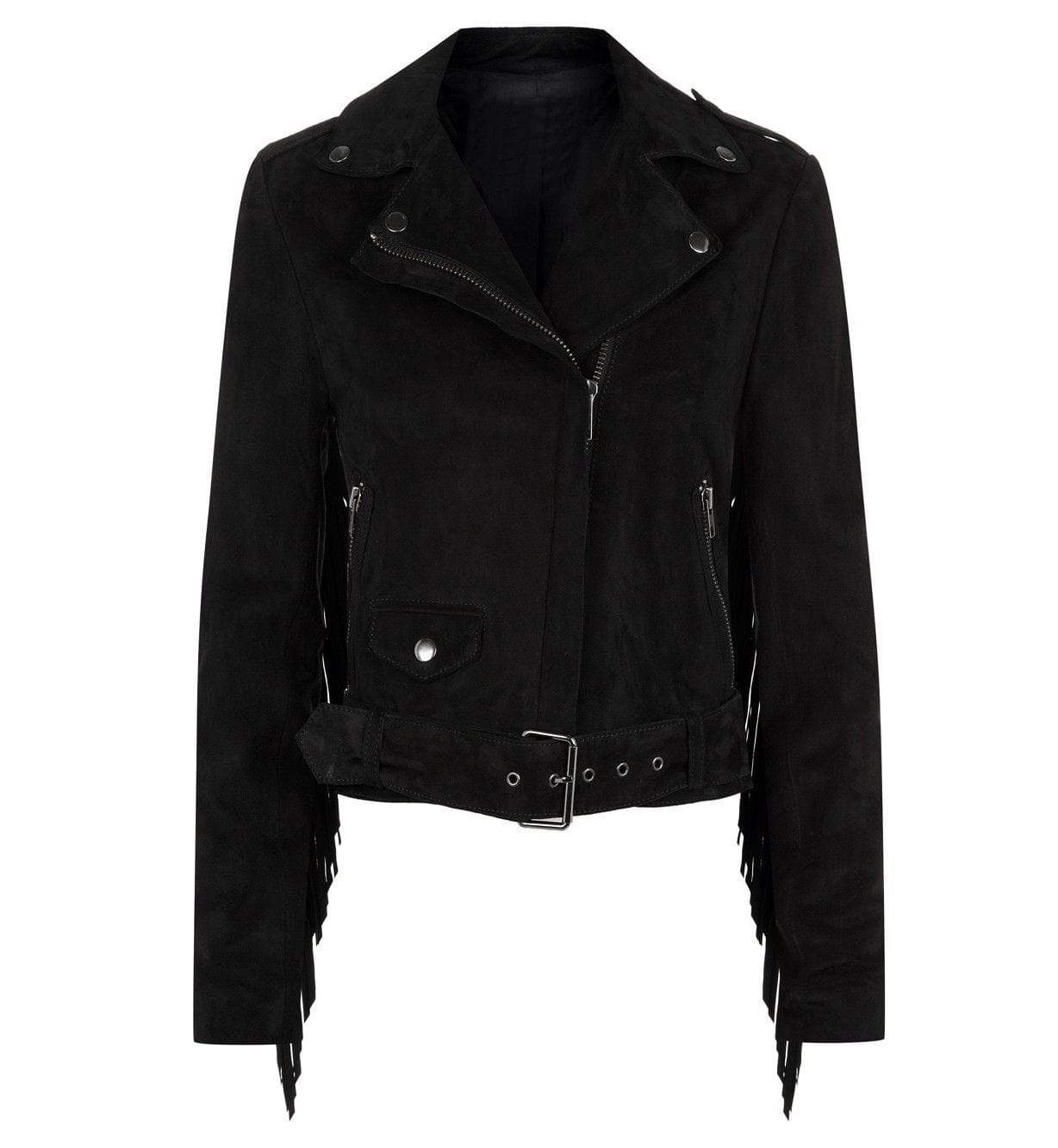 Handmade Men's Black Zipper Fringe Suede Belted Fashion Jacket