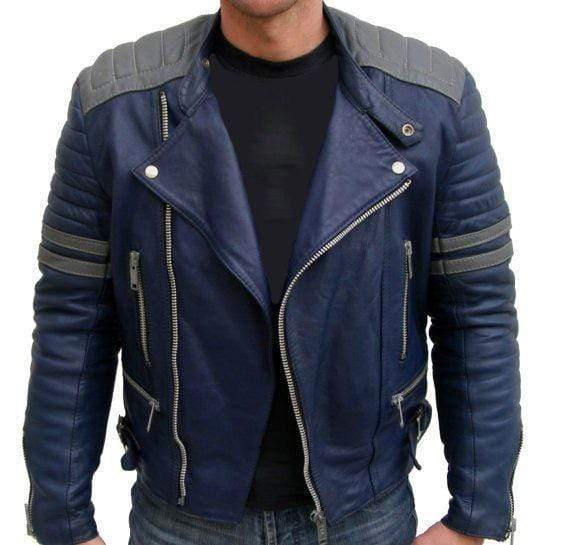 Handmade Men's Navy Blue Gray Fashion Leather Zipper Jacket