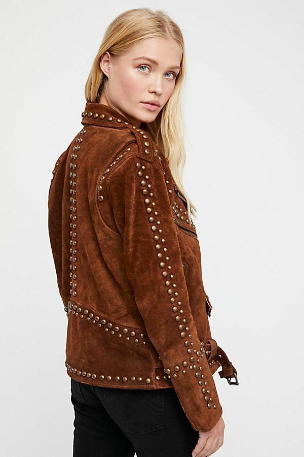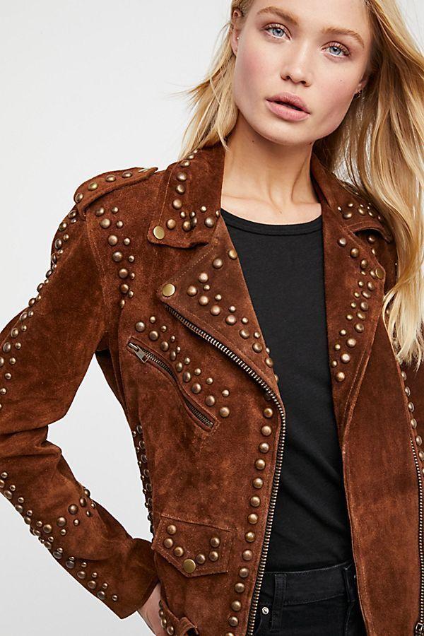 Women Handmade Brown American Western Were Golden Studded Suede Leather Jacket