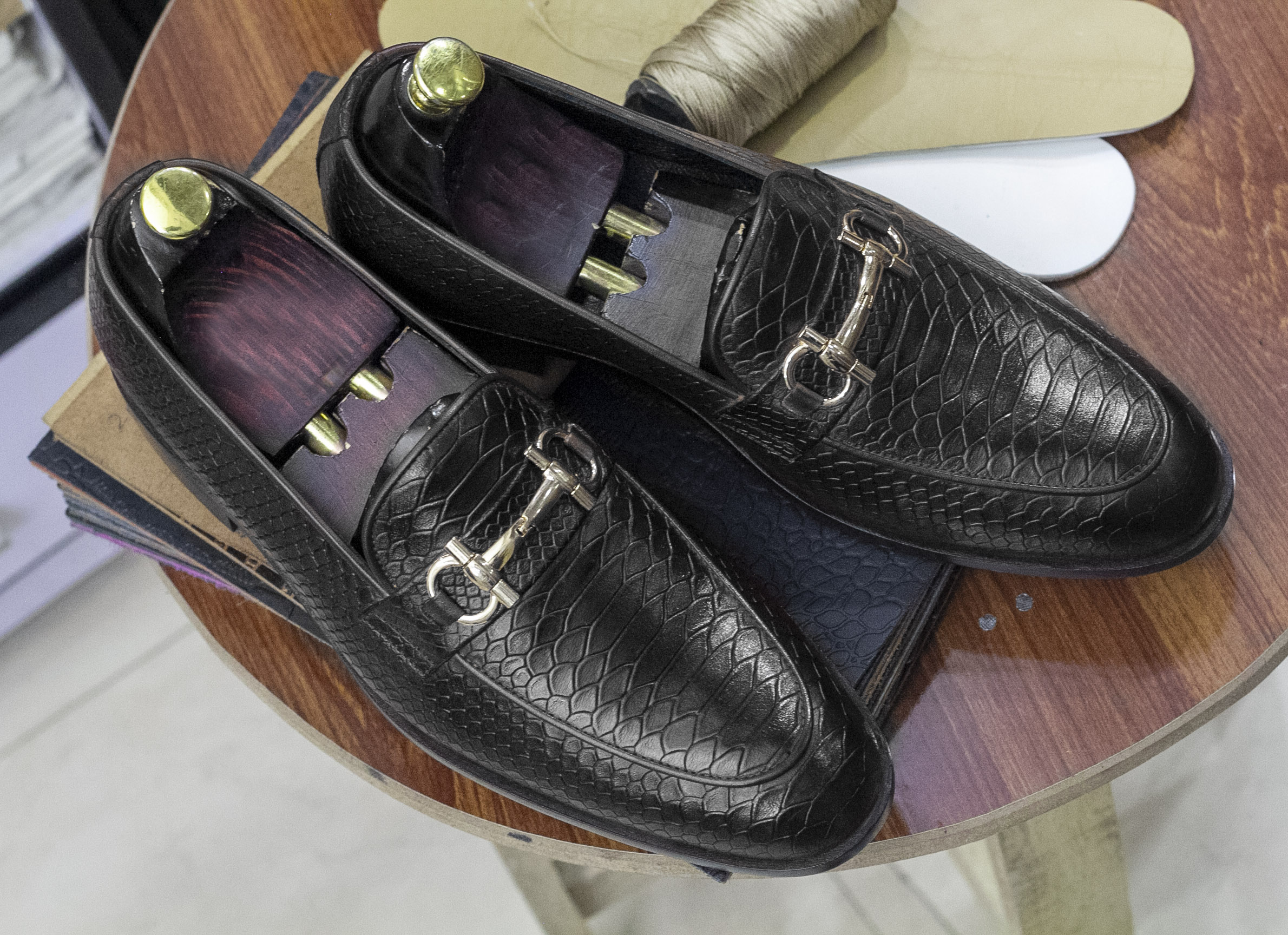Men's Black Handmade Python Skin Textuer Apron Toe Leather Loafers