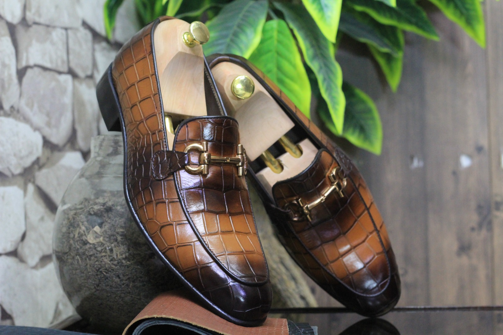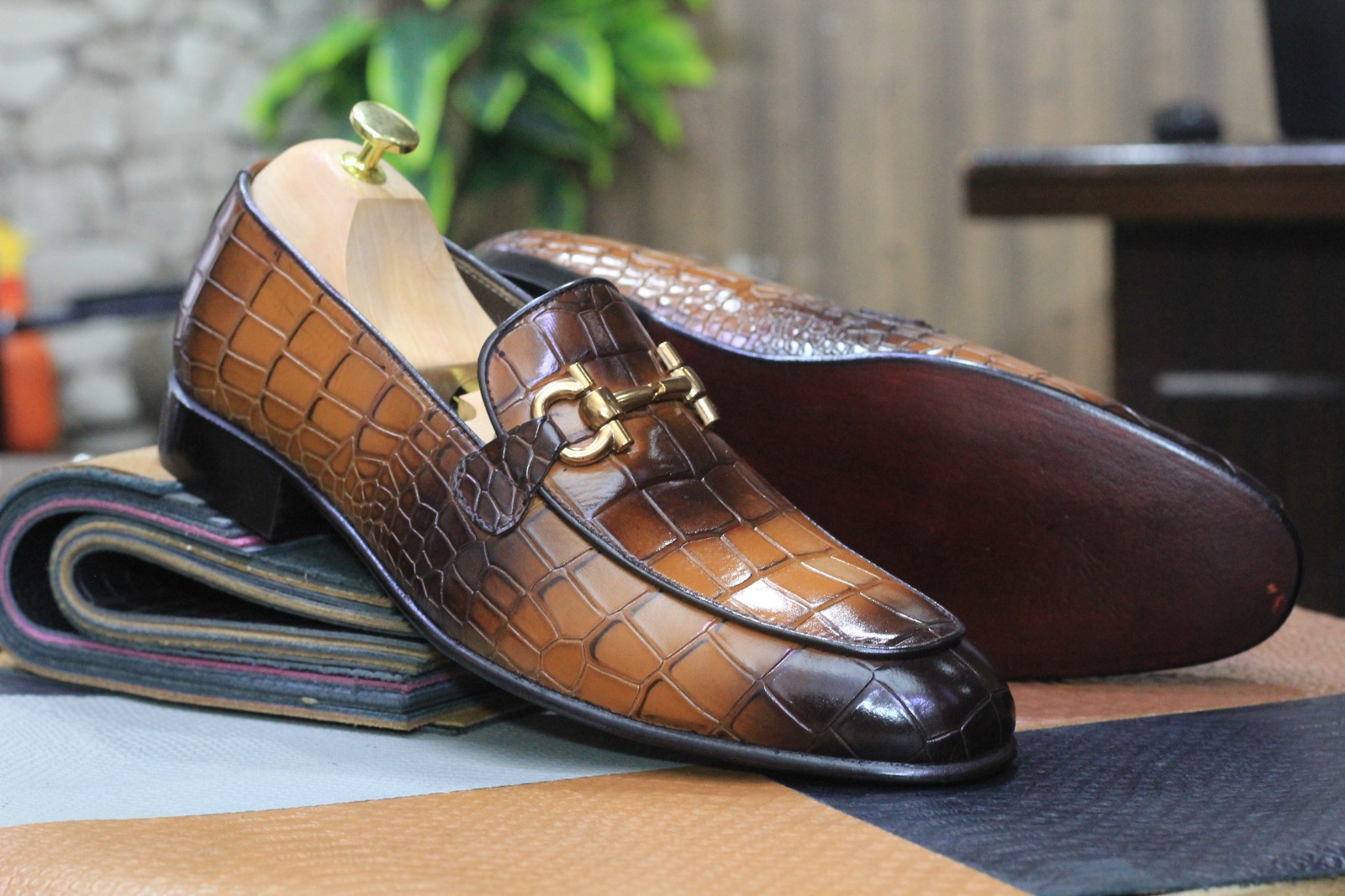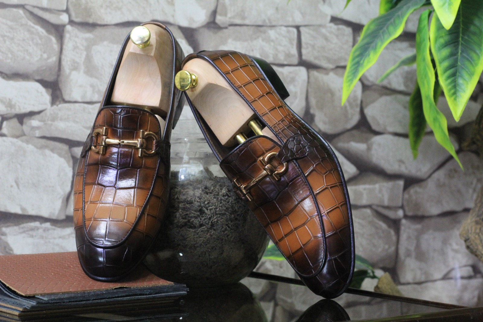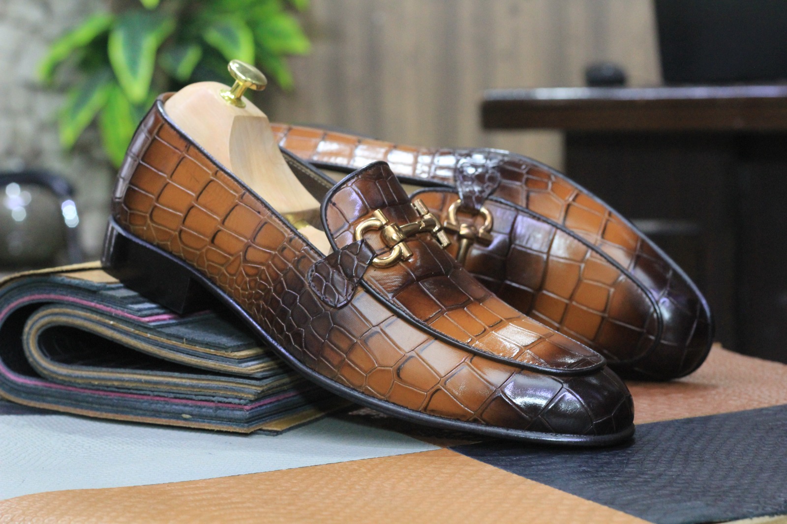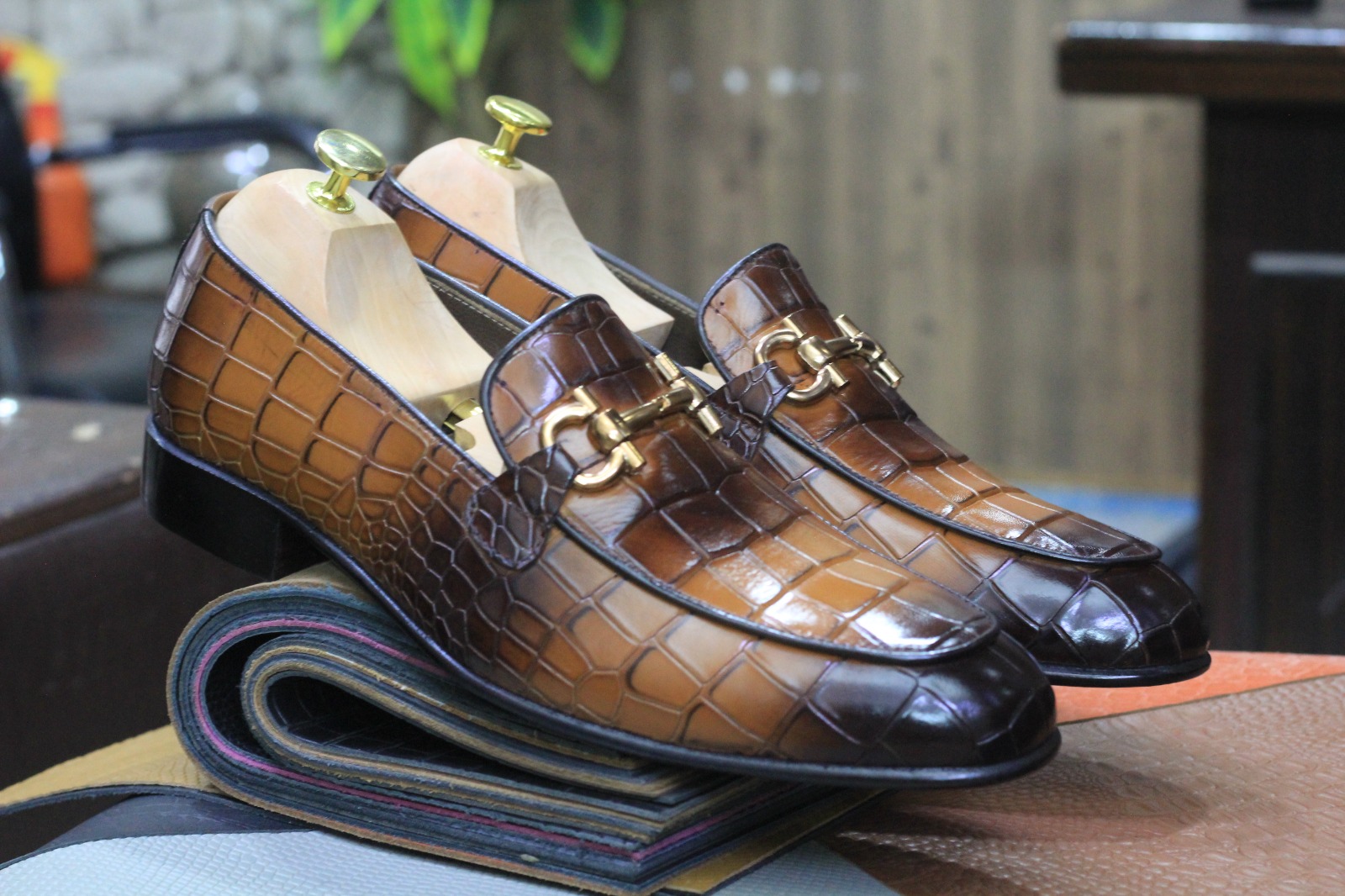 Bespoke Handmade Two Shaded Brown Color Alligator Texture Leather Horse Bit Style Designer Loafer Shoes for Men's