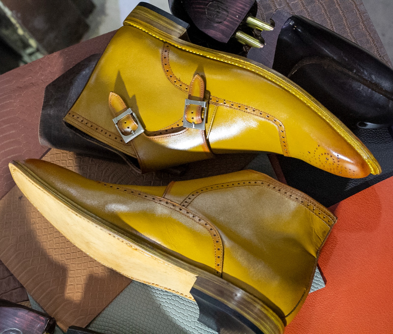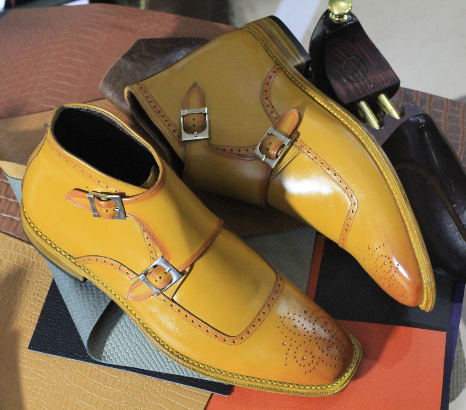 Mustard Color Double Buckle and Brogue Toe Style Half Ankle Handmade Leather Designer Boots for Men's